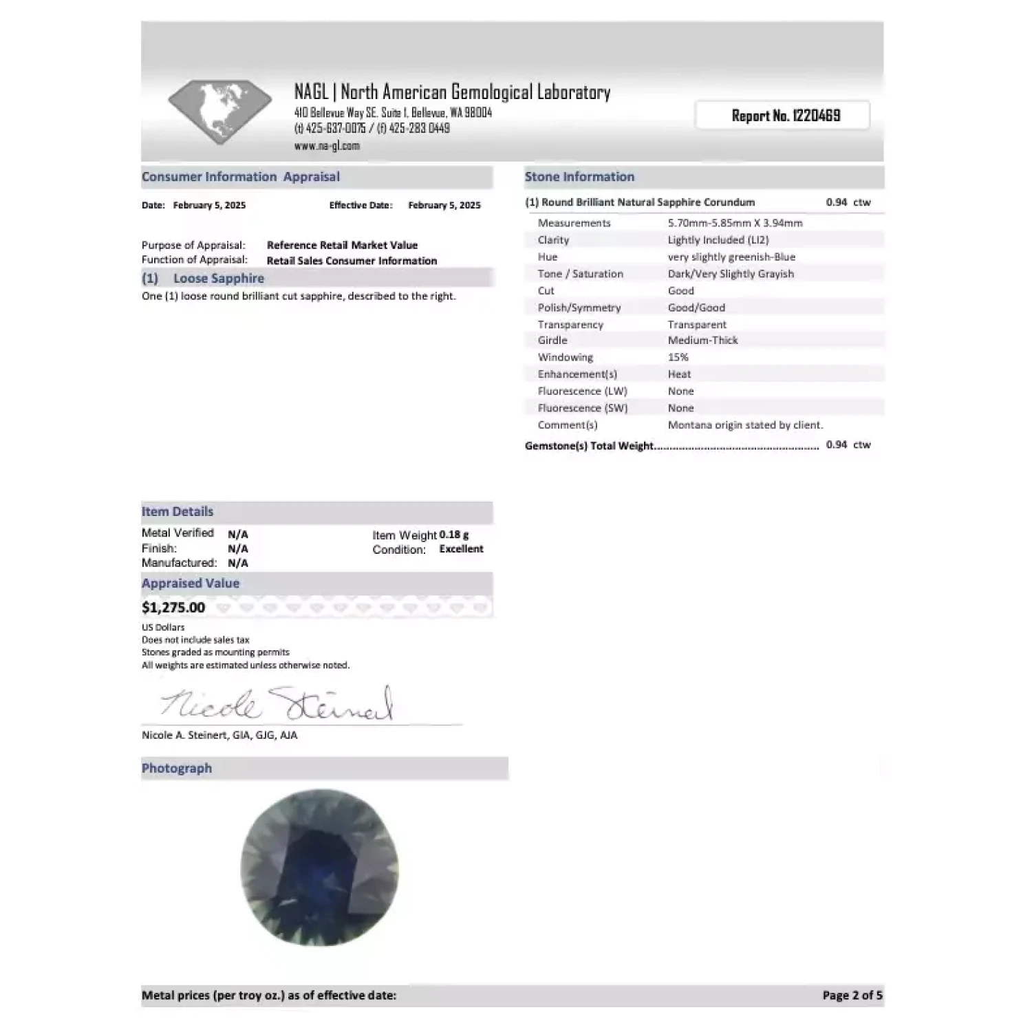 This 0.94ct Montana Sapphire comes with a certificate from the North American Gemological Lab in Bellevue, Washington.