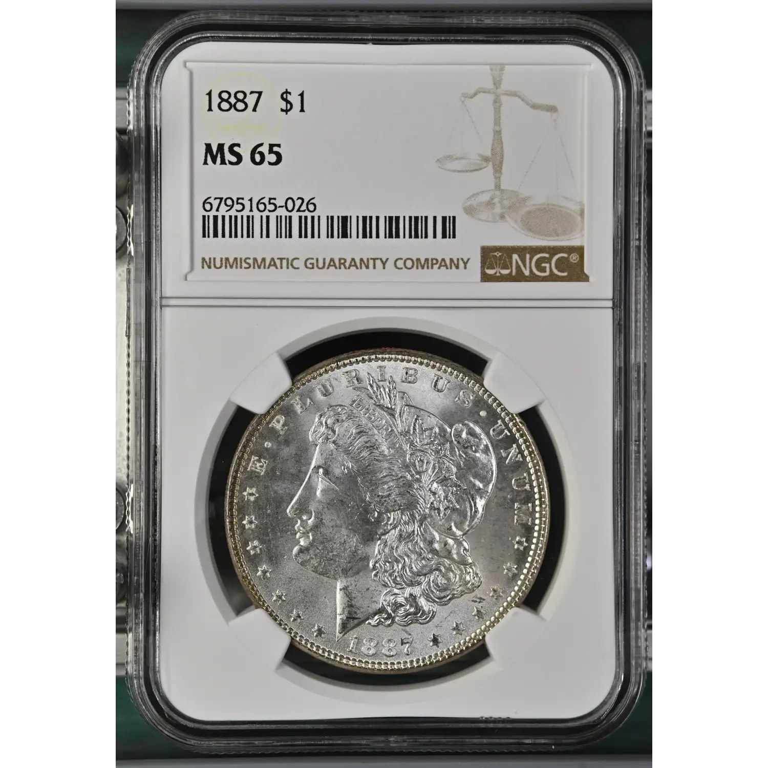 Graded by the Numismatic Guaranty Corporation (NGC) as an MS-65, this 1887 Morgan Silver Dollar is in exceptional condition, boasting a high level of detail and preservation. The MS-65 grade indicates that the coin is virtually flawless, with only minor imperfections visible under close inspection, ensuring a captivating visual experience for collectors and investors alike.