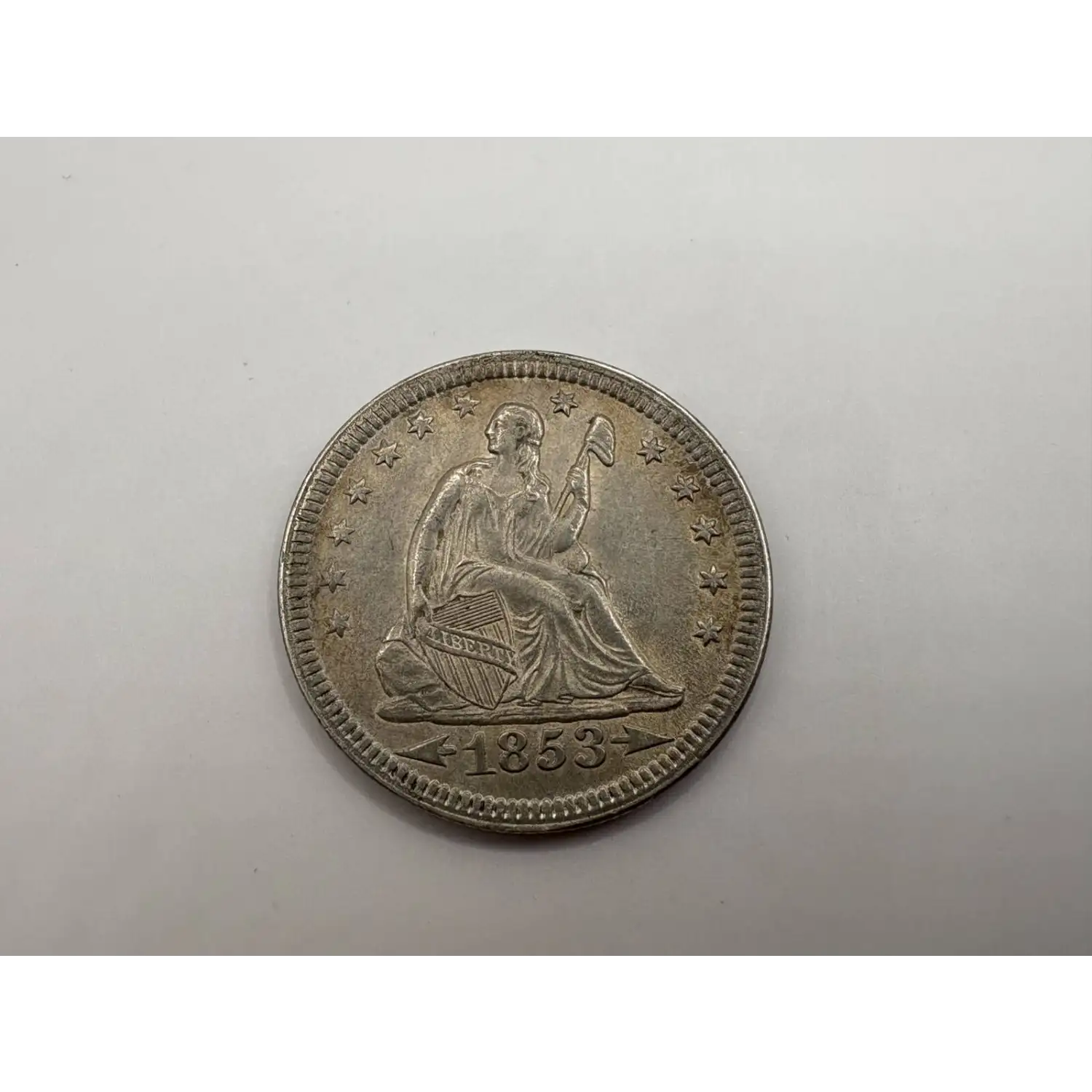 Introducing the remarkable 1853 Seated Liberty Quarter from the United States, featuring a captivating Arrows and Rays design along with a rare 15-degree die misalignment error. This numismatic treasure is graded in the coveted AU+ (About Uncirculated Plus) condition, offering collectors and enthusiasts a unique glimpse into the past.