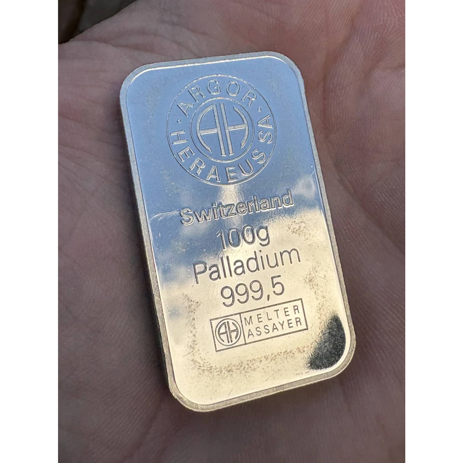 Palladium is a highly popular investment metal in the precious metals market. Each 100g Heraeus Palladium Barcontains 100 gramsof fine .9995palladium.A larger Palladium bar tends to have a lower premium per troy ounce when purchasing given the relatively fixed cost of production being absorbed into a much larger gold bar.