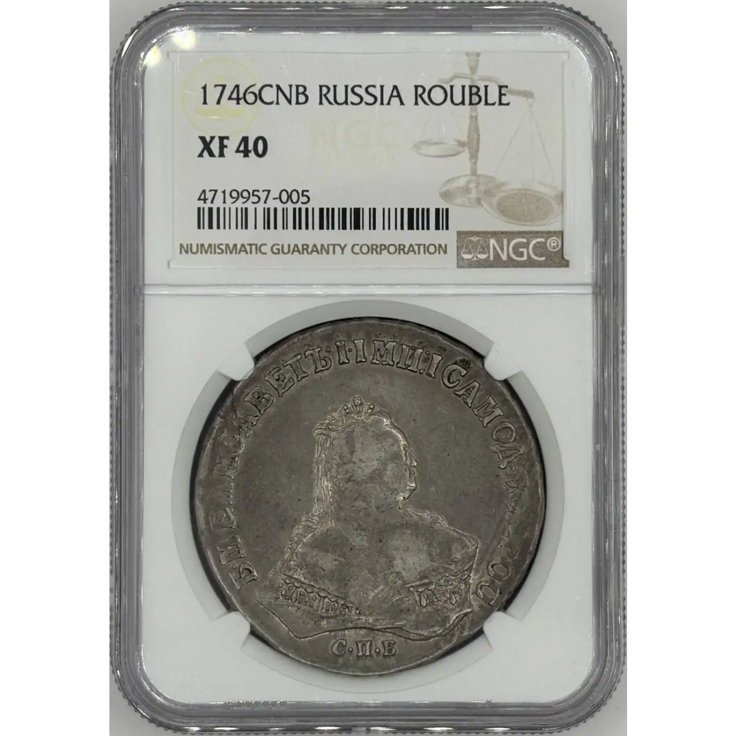 Introducing the captivating '1746 CNB Russia Silver Rouble Elizabeth Crowned Bust (1742-1751) NGC XF-40 C# 19.1', a stunning numismatic treasure from the rich heritage of Russia. This exquisite silver coin is a testament to the remarkable reign of Empress Elizabeth, who ruled the Russian Empire from 1741 to 1761.