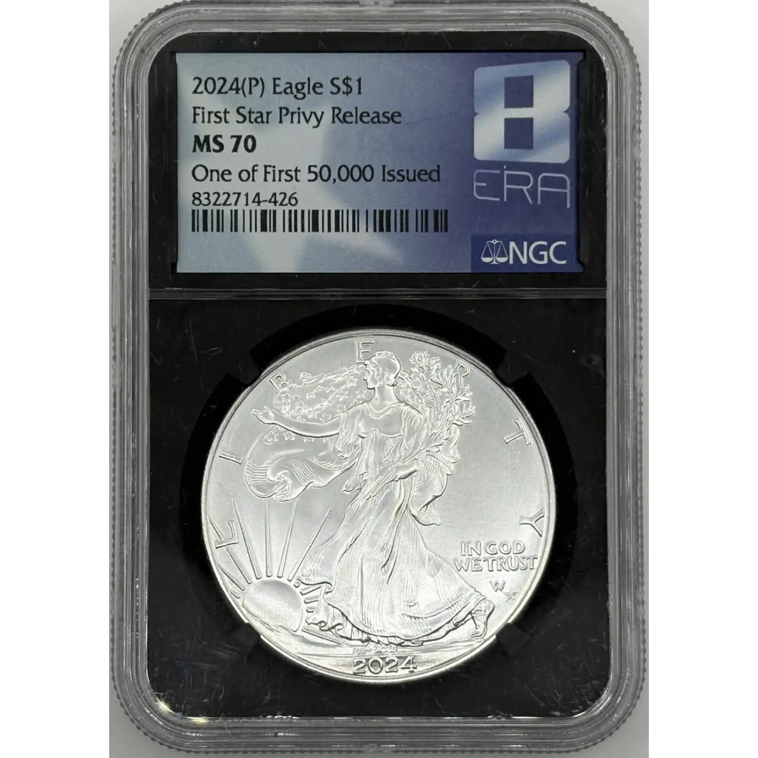 The 2024 P Bullion Silver Eagles NGC MS-70 First Star Privy Release is a highly sought-after numismatic coin from the United States Mint. This remarkable silver coin is part of the iconic American Eagle series, which has been captivating collectors and investors for decades.