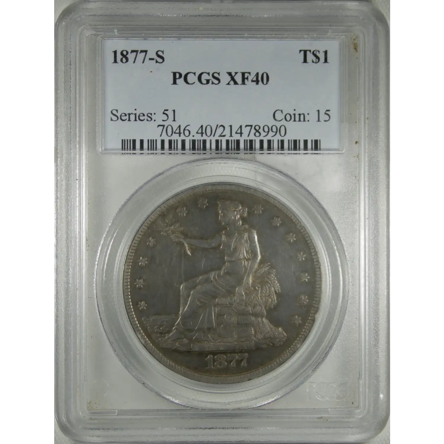 The 1877-S Trade Dollar was struck at the San Francisco Mint with a mintage of 9,519,000, the highest output of the series. These coins were produced for circulation in Asian commerce as part of the U.S. Trade Dollar program (1873–1885).