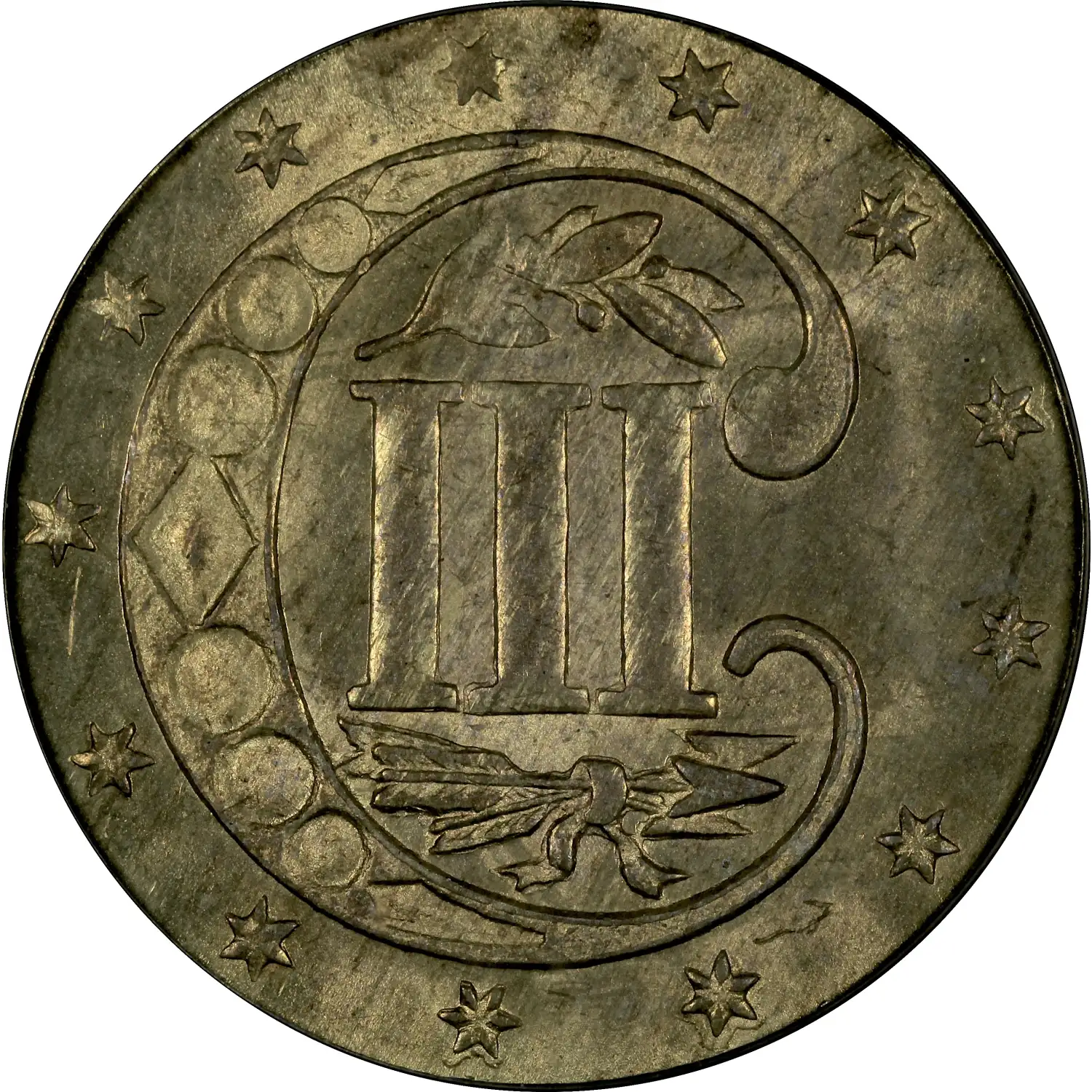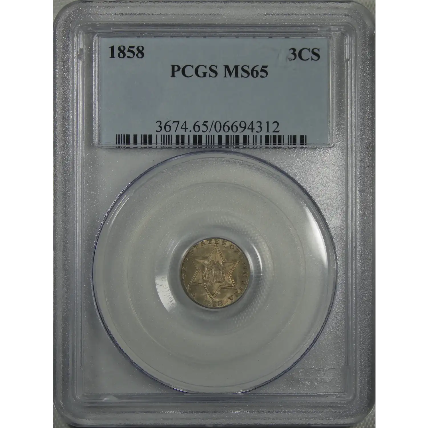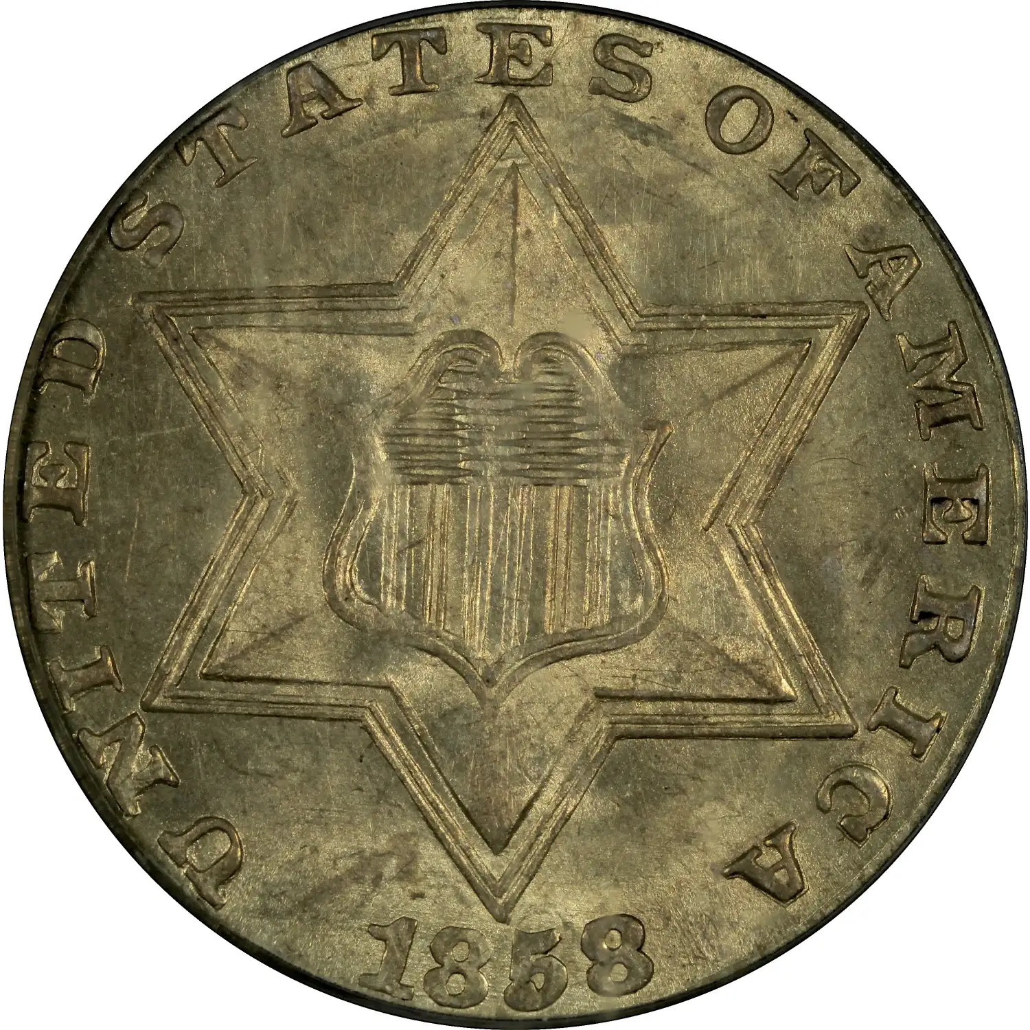 The 1858 Silver Three-Cent Piece (often called a “trime”) was struck at the Philadelphia Mint as part of the small silver denomination introduced in 1851. These coins were intended to facilitate postage purchases and small transactions during a period of silver shortages.