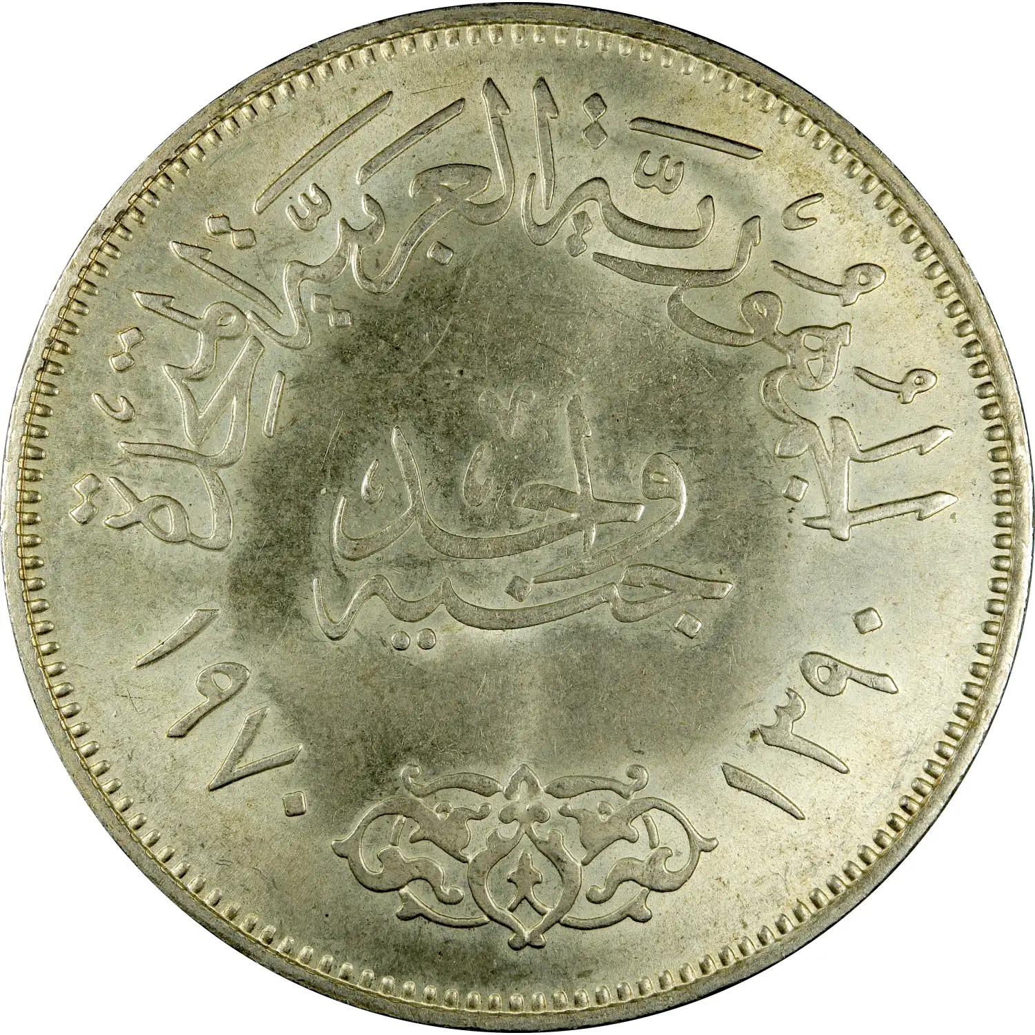 The 1970 Egypt Silver Pound (1 Junayh) was issued under President Gamal Abdel Nasser during the Arab Republic era. This is a crown-sized silver commemorative struck at the Cairo Mint.