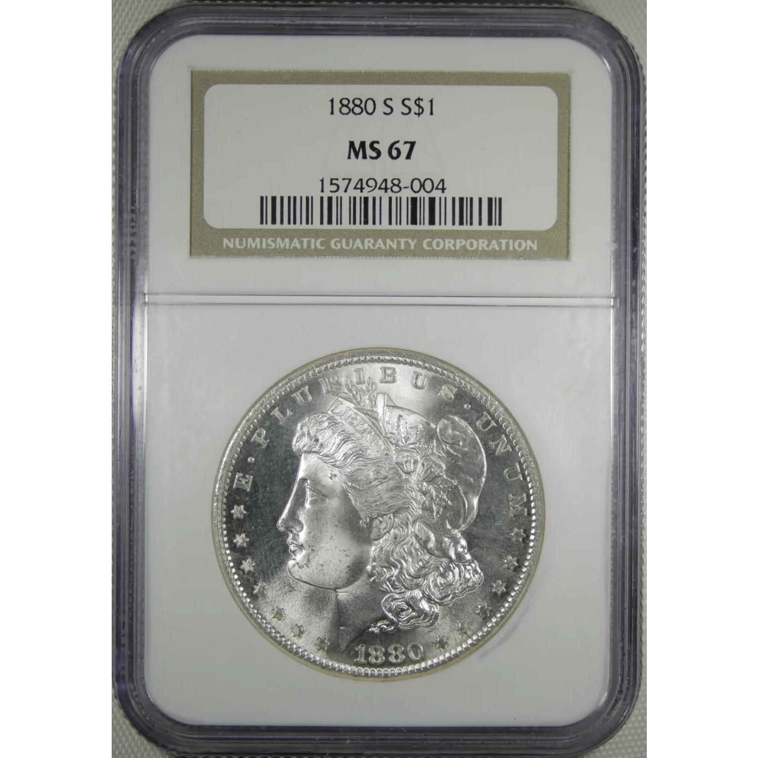 The 1880-S Morgan Silver Dollar was struck at the San Francisco Mint, a facility known for producing well-struck Morgan dollars with strong luster. The 1880-S issue is widely recognized for its high quality and large surviving population in upper Mint State grades.