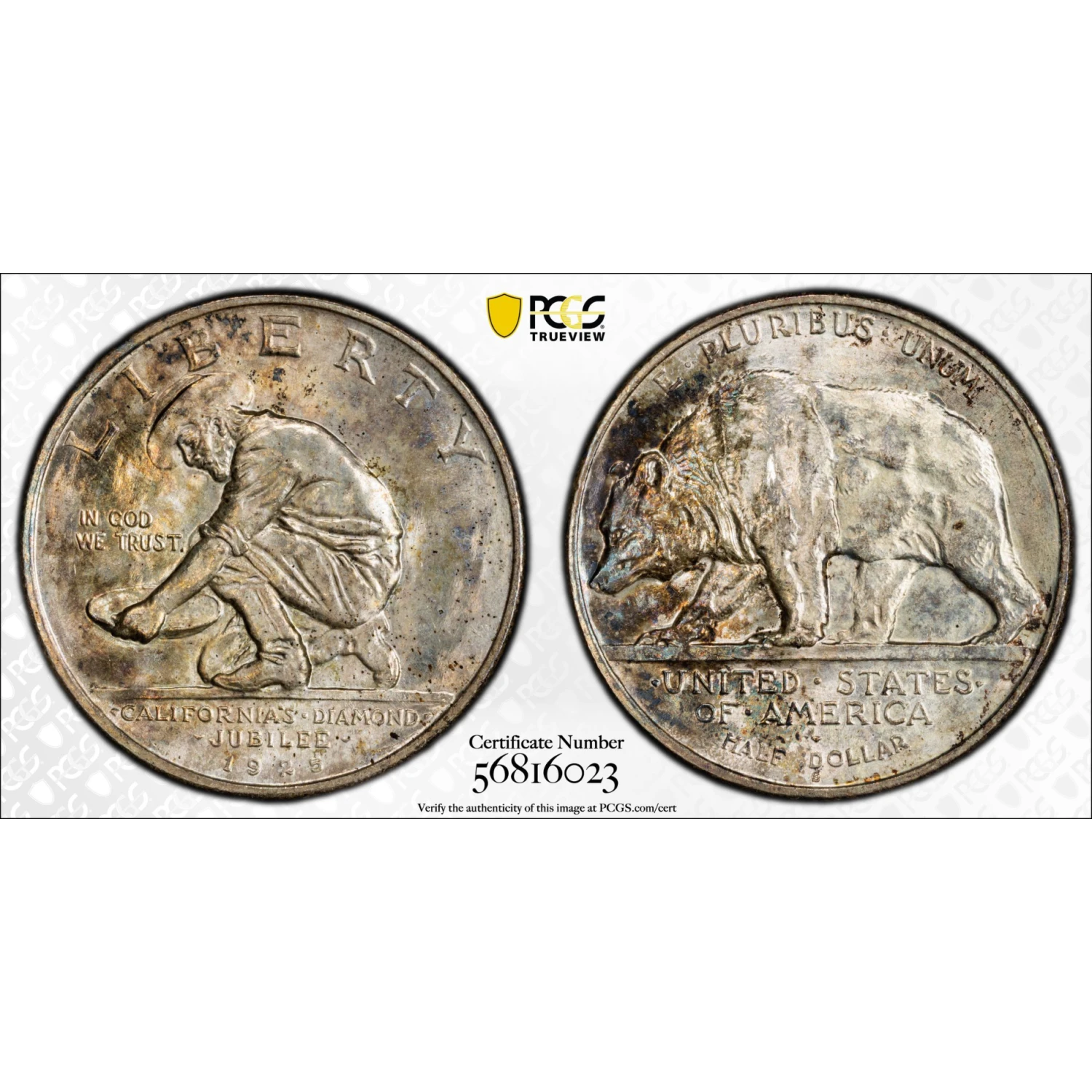 The 1925-S California Diamond Jubilee Half Dollar was struck at the San Francisco Mint to commemorate the 75th anniversary of California’s admission to the Union. Authorized by Congress and issued for a limited period, the coin features a gold prospector on the obverse and a grizzly bear on the reverse.